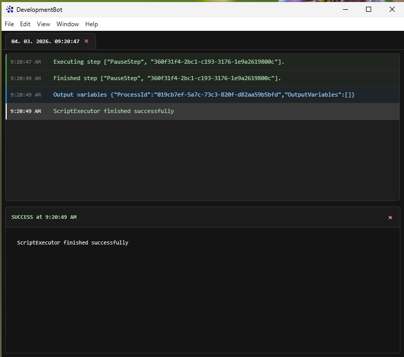 F5to run the process on your local robot. - DevelopmentBot window will open. If you see a ""Process finished successfully"" message, your robot is working right.