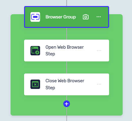 To assist with automating web browsers, please note that each step added to a group will automatically use the driver referenced in the Open Web Browser Step. However, if you include multiple Open Web Browser steps, the reference will not be added automatically; in that case, you will need to add it manually. Additionally, at the beginning of the group, there will be a button to record steps, which will be available once you select the browser type (Chrome or Edge) and enter the URL. The recorder will automatically add the steps and selectors for each element you need.