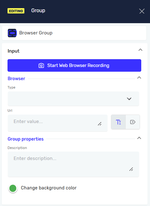 This is a predefined group for working with web automation. For each session, you will have a new group that contains the Open Web Browser and Close Web Browser steps. You can change the color of this group, along with its name and description. You can add a type and URL, and it will automatically be applied to the Open Web Browser step. The same applies when you use the field in the Open Web Browser step; it will also be visible in the group.