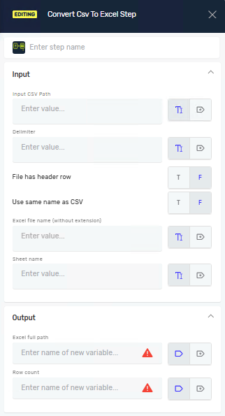 This step converts a CSV file into an Excel (.xlsx) file. It allows defining custom delimiters, handling header rows, and specifying the Excel file and sheet names. The step simplifies data transformation between formats, making it easier to process structured data in Excel for reporting or analysis.