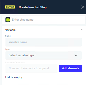 - Initial value (Not required) - add the value of a variable depending on the selected list type (integer or string). In the case of the integer type, it must have an initial value.