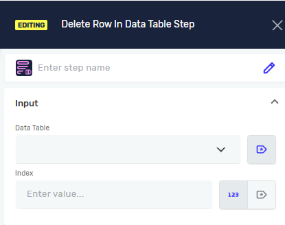 This step permanently deletes a row from the data table structure during automation. Be cautious when defining the Index value — if the index is out of range or invalid, the operation will not succeed.