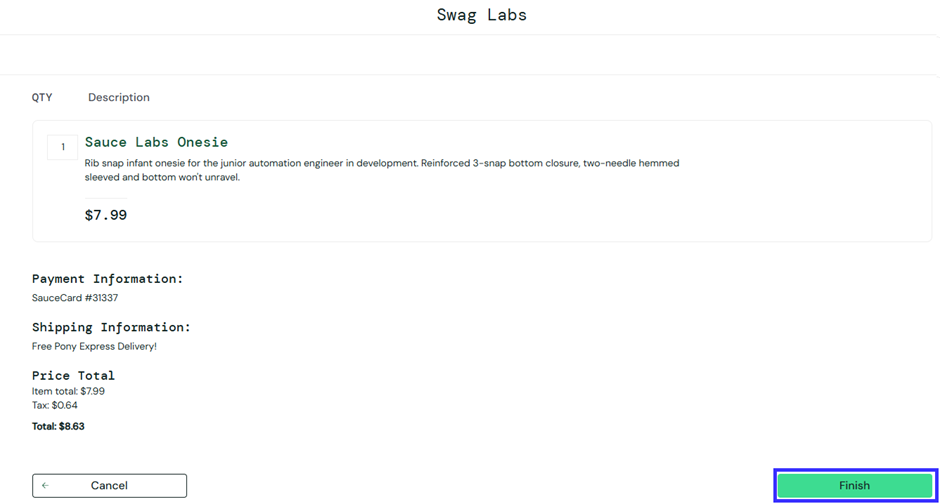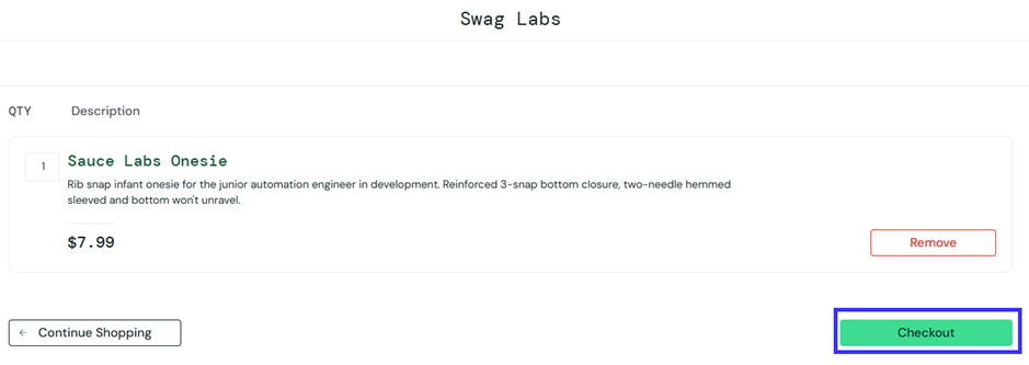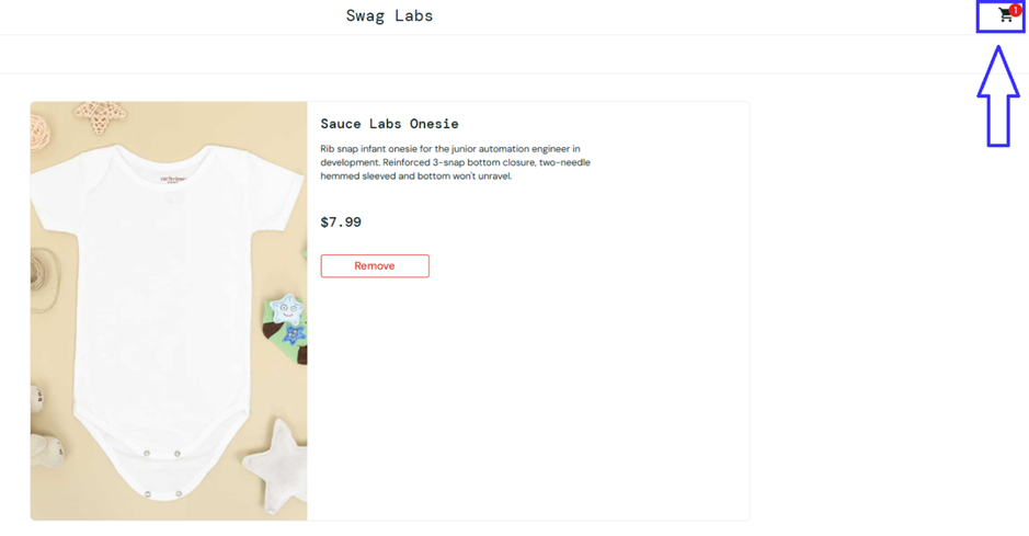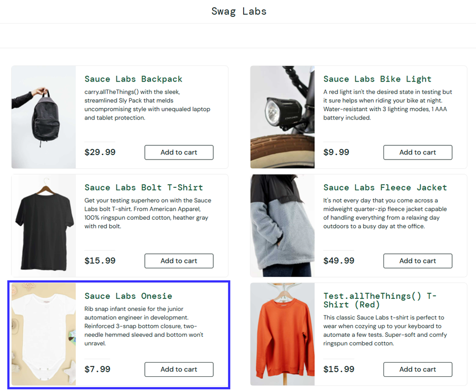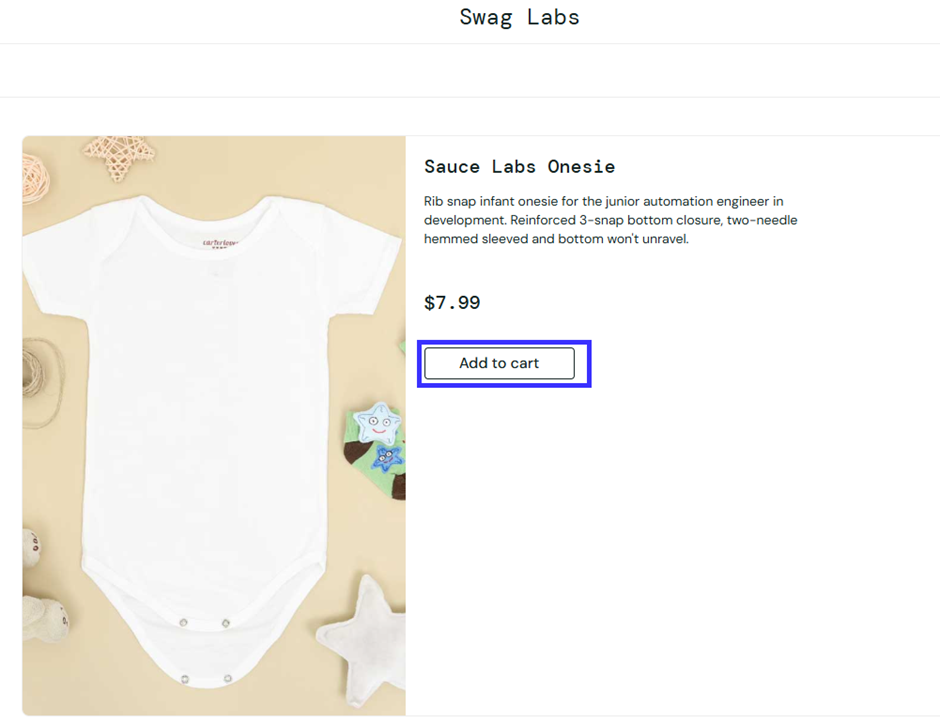 Enter "standard_user" as the username and "secret_sauce" as the password to log in. From the list of items, select white body with the name "Sauce Labs Onesie" and add it to your cart.