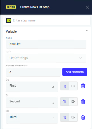 Next, we will add the element "First" as the last element of the list. We can do this by selecting the "Add to the end of list" option. Finally, we will save the output list in the first list and store the number of elements in a new variable called `ElementCount`.
