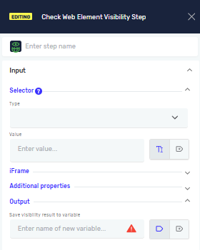 The Check Web Element Visibility step checks whether a specific web element is currently visible on a page. It is useful for validating page state, controlling flow logic, and ensuring elements are available before continuing automation.