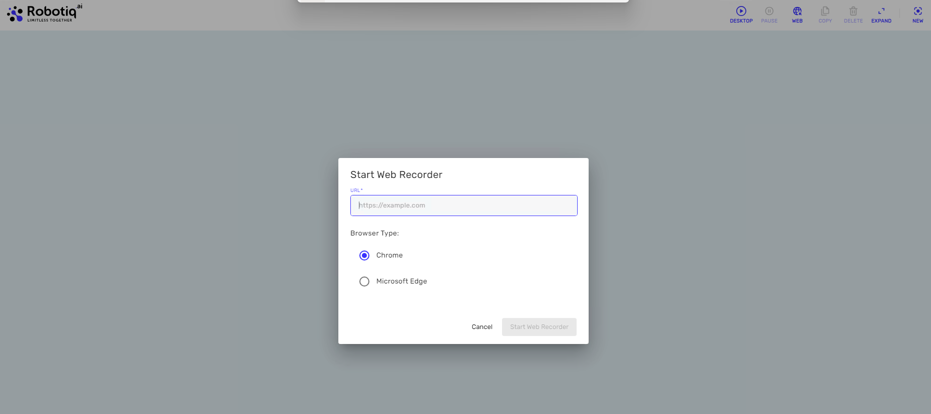 Click on Browser to record actions in a web application. Enter the browser type (e.g., Chrome, Edge) and the target URL before starting the recording. The recorder will automatically group all steps performed in that browser session into a single Web group.