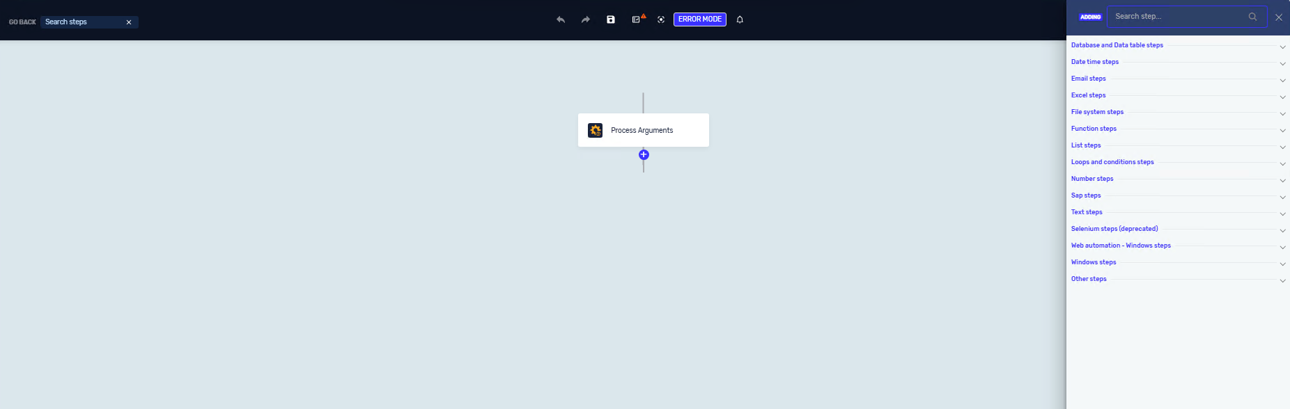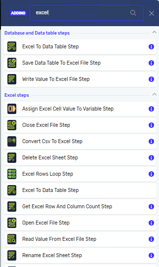 When you click on the “+” button to add a new step, the search field is automatically focused, so you can immediately start typing if you already know the step name. Alternatively, you can expand a category to browse all available steps within that group — for instance, expanding the Excel category will show all Excel-related steps. Some steps are included in multiple categories when it makes sense for their functionality. For example, the Excel to Data Table step appears under both the Excel and Database & Data Table categories.