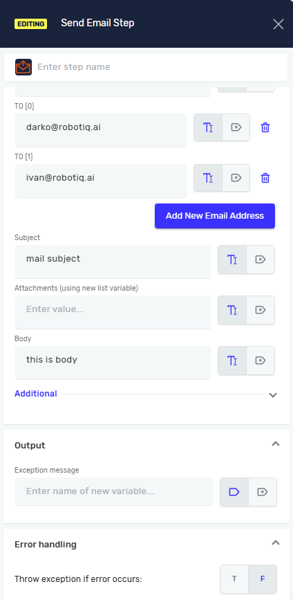 The "Sent To", "CC", "BCC" and "Attachments" fields now support adding string values as new recipient lists, allowing for more dynamic address handling. - Enhanced error handling: