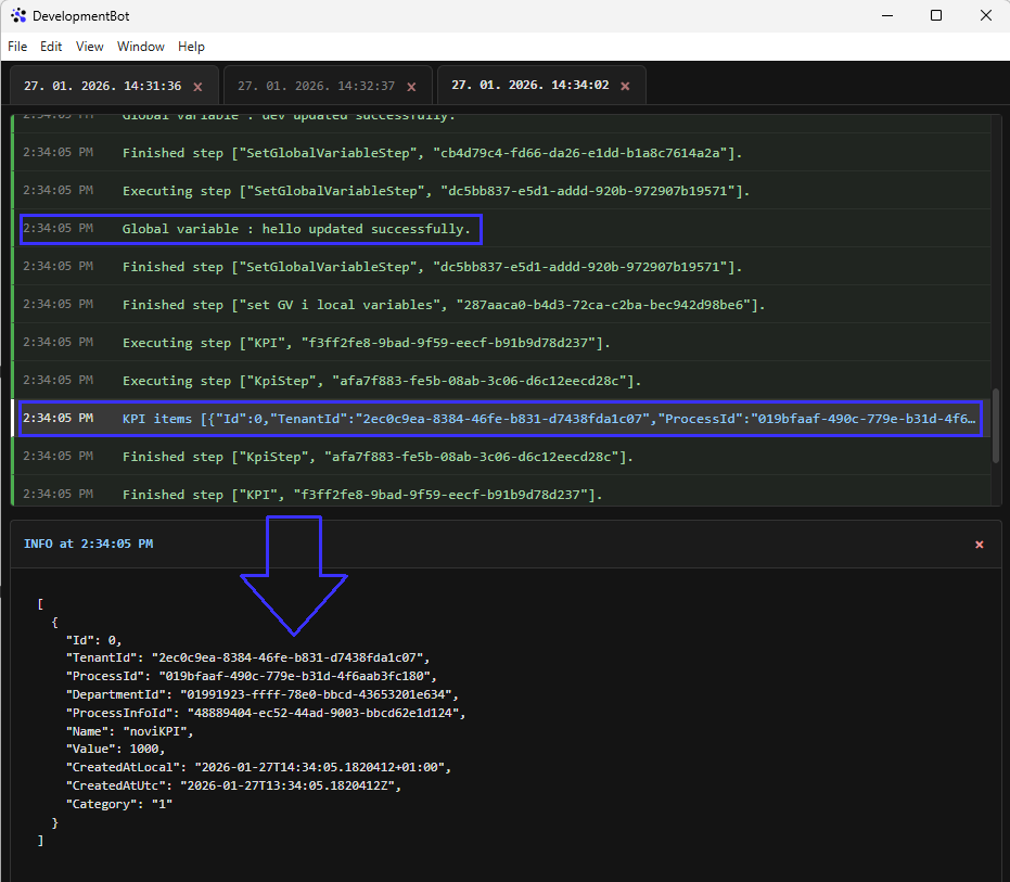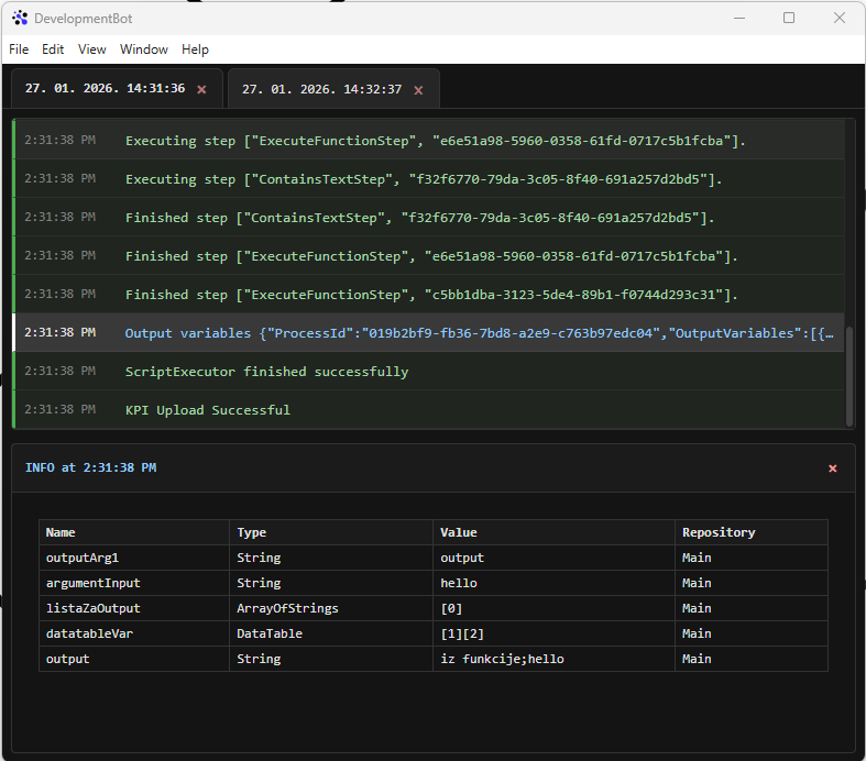 At the end of the execution, you can review all variables stored in the Variable Repository after the process has completed This gives you full visibility into what happened during execution and the final state of your data.