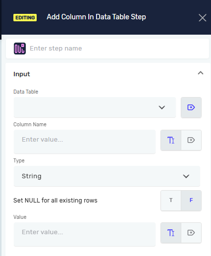 Adds a new column to an existing data table. This allows dynamic expansion of data structures as the automation runs.