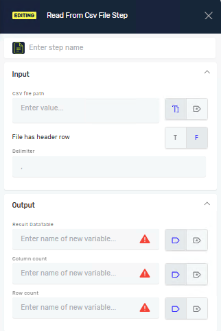 This step allows reading data from CSV files directly into DataTable variable. You can select whether the file has headers, define custom delimiters, and specify how many columns to import.