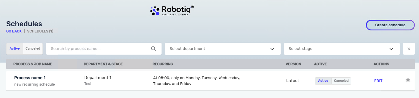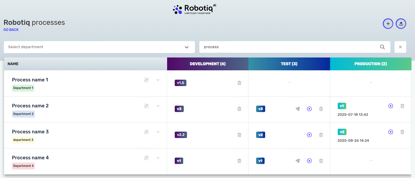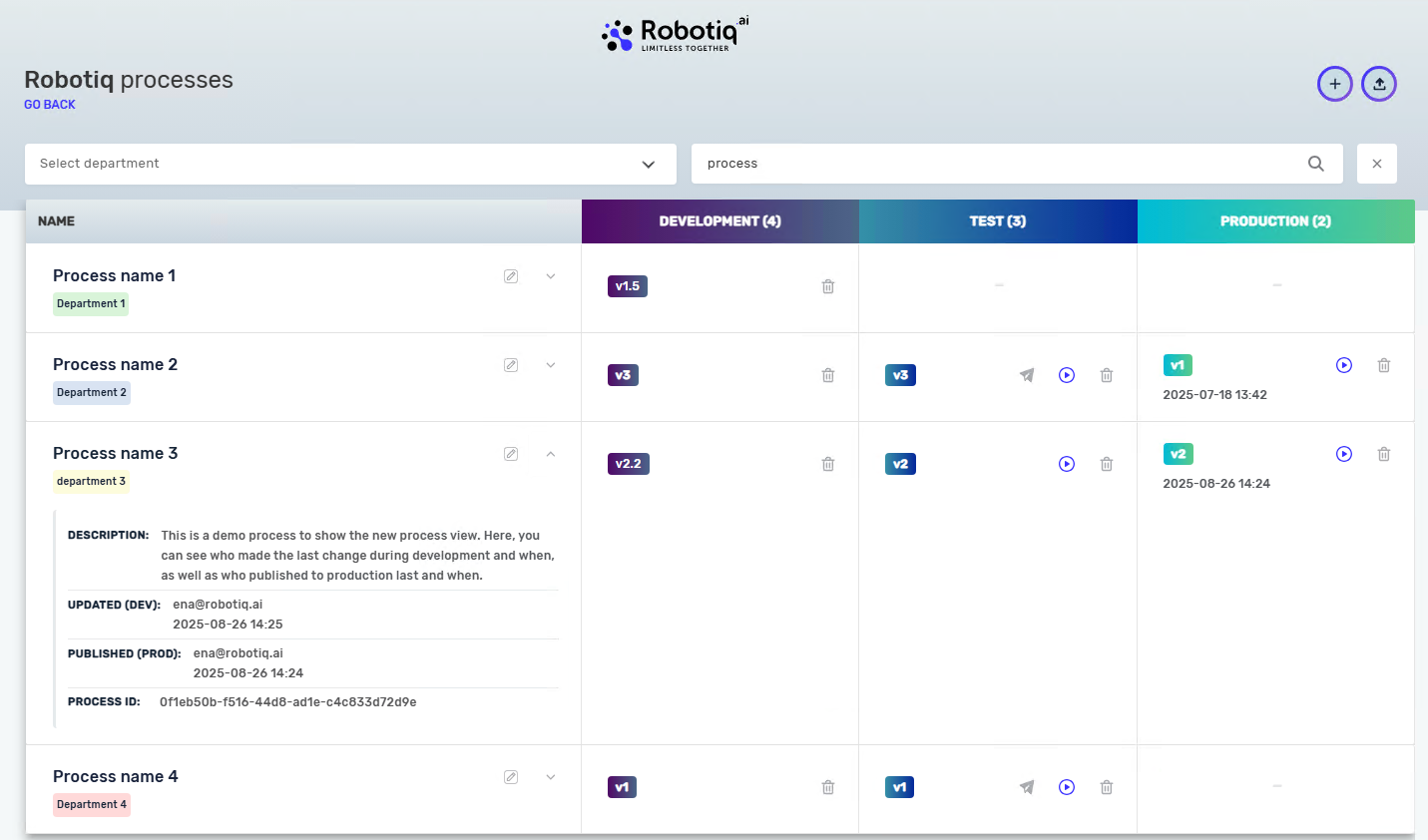 We have enhanced the process view to provide you with an improved user experience (UX). In the new view, you can see for each process whether it is in the Test or Production stage, along with information about the latest version at that stage. Some functionalities remain the same as before, such as deleting an entire process or version and running an ASAP job. However, we have added a new option for publishing, which is available only for promoted processes that have a greater version than the one currently in the Test or Production stage.