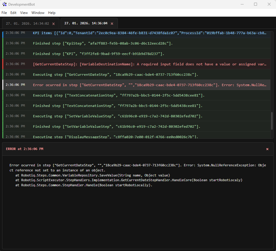 Each process execution is displayed in a new tab, labeled with the execution date and start time. You can search within the log using Ctrl + F.
