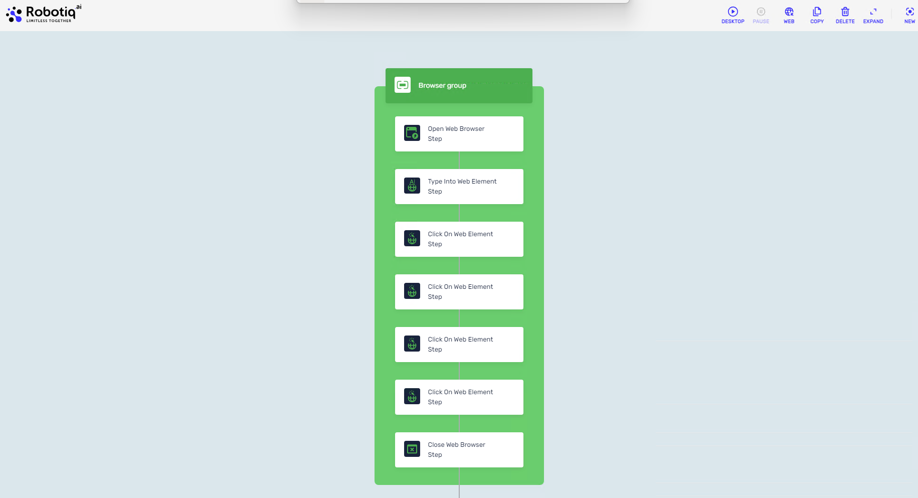 Each web group includes Open Web Browser Step at the beginning and Close Web Browser Step at the end by default.