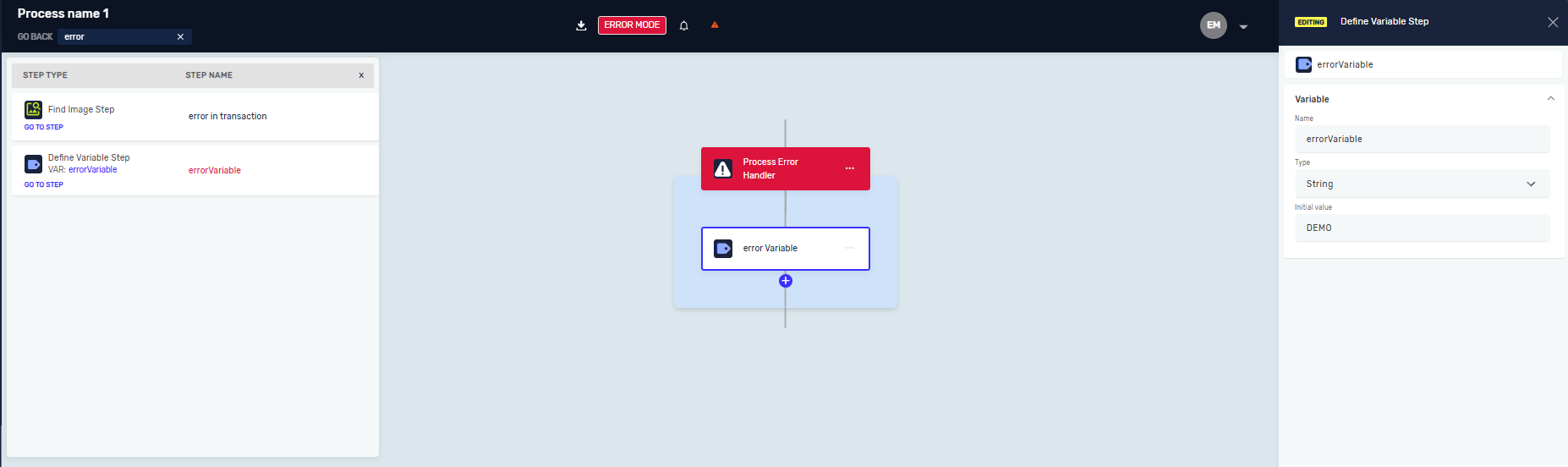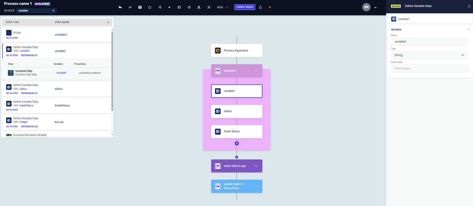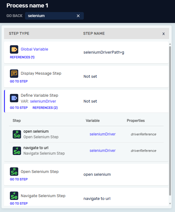 In progress, you will now be able to search for step names, step types, or variable names. If you locate a step where a variable is defined for the first time in the process (for example, if a variable is defined in the output of any other step), that step will be displayed along with references to other steps that use that variable. If the variable is a global variable, it will be shown slightly differently since its initialization is located in the Global Variable menu.