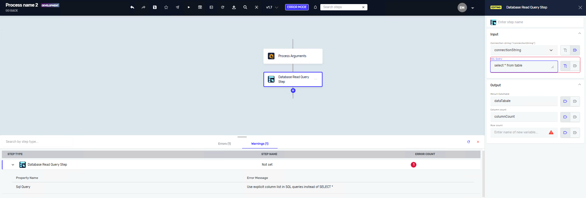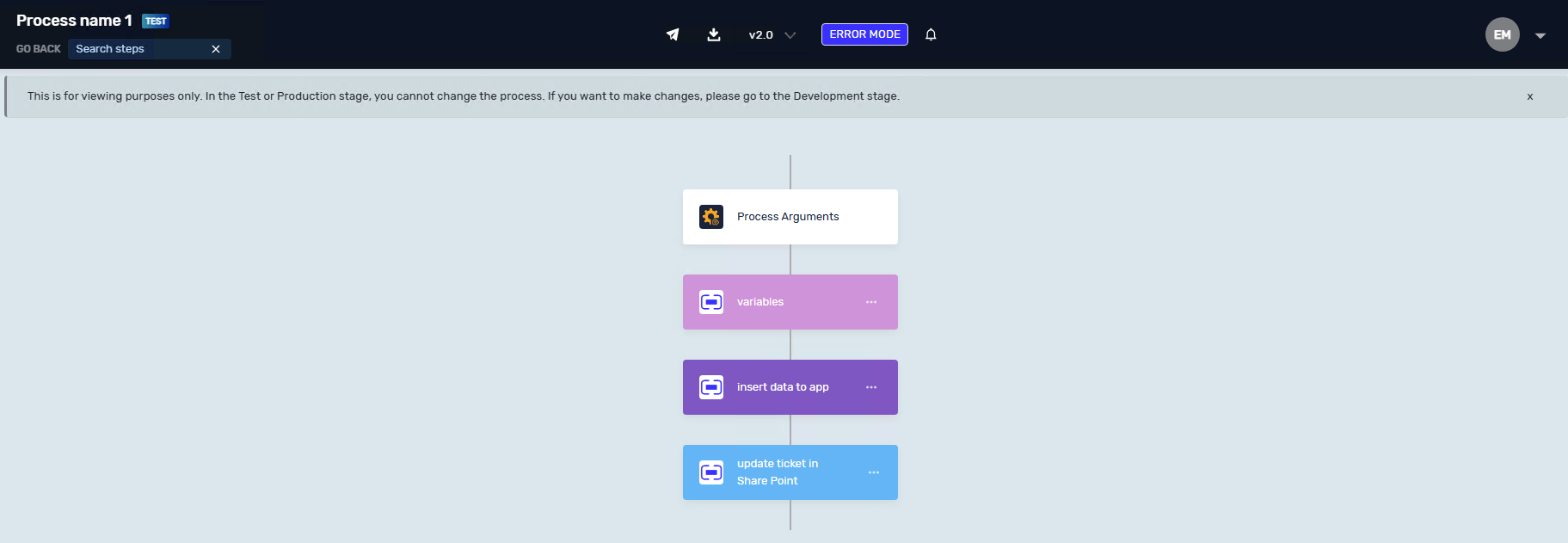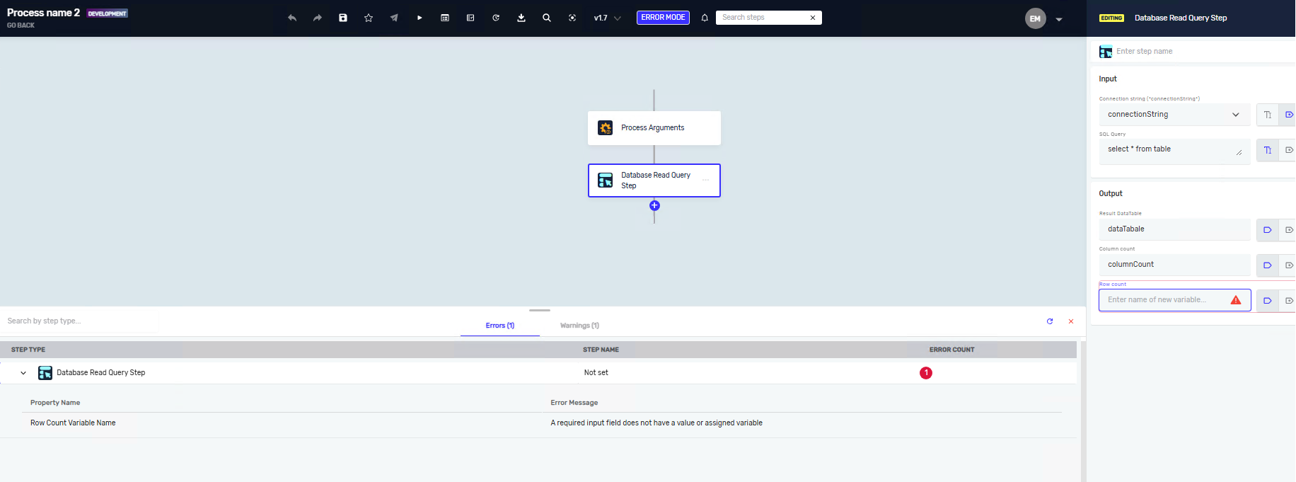 For the processes you are implementing, you may encounter Errors and Warnings. Errors are critical issues that, if not addressed, will cause the robot to finish with an error. If you notice something that should be marked as an error but isn’t (we can check for validation at a step without executing the process), please provide feedback by clicking on the Help Center and sending a screenshot.