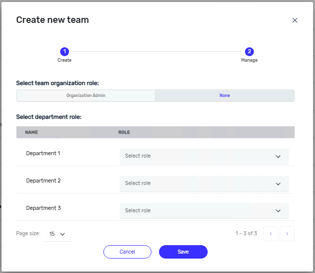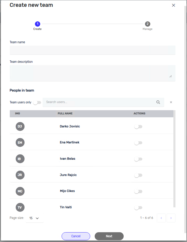 To create a new team, we enhance the process so that in one step, you can add people and manage the new team without needing to click two separate buttons.