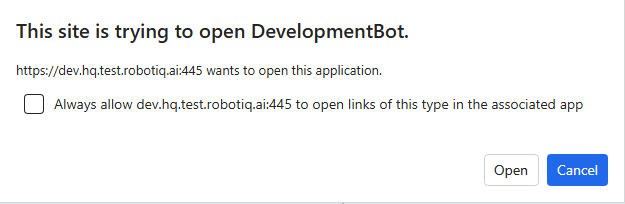 If you choose to use the Latest Development Bot, you will most likely receive a prompt asking you to allow DevelopmentBot to make changes. You must approve this prompt for the bot to start.
