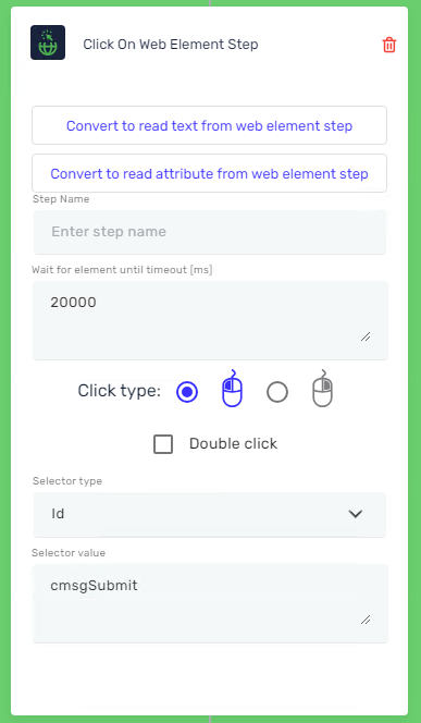 Additionally, the Click on Web Element Step can be converted into a Read Text From Web Element Step or a Read Attribute From Web Element Step, allowing greater flexibility in defining how web elements are used during automation.