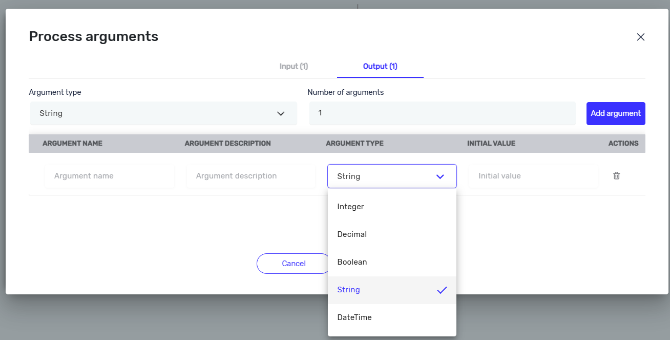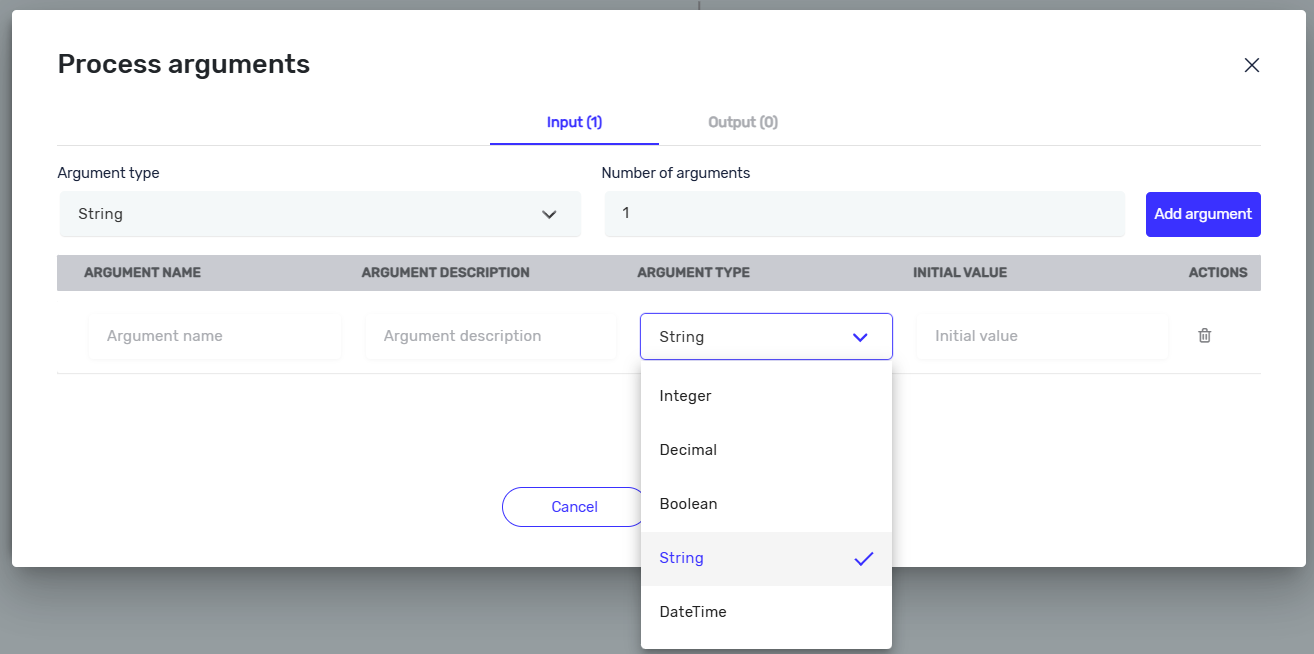You can add variable types of Integers, Decimal, Boolean, String, and DateTime by pressing the “Add argument” button. Press “Confirm” to finish adding arguments.