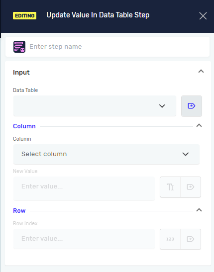 Once the data table is selected, its column names are loaded dynamically and become available for selection in the Column dropdown list. - Column (Required) – selects the column where the value will be updated. The dropdown displays all column names from the selected data table
