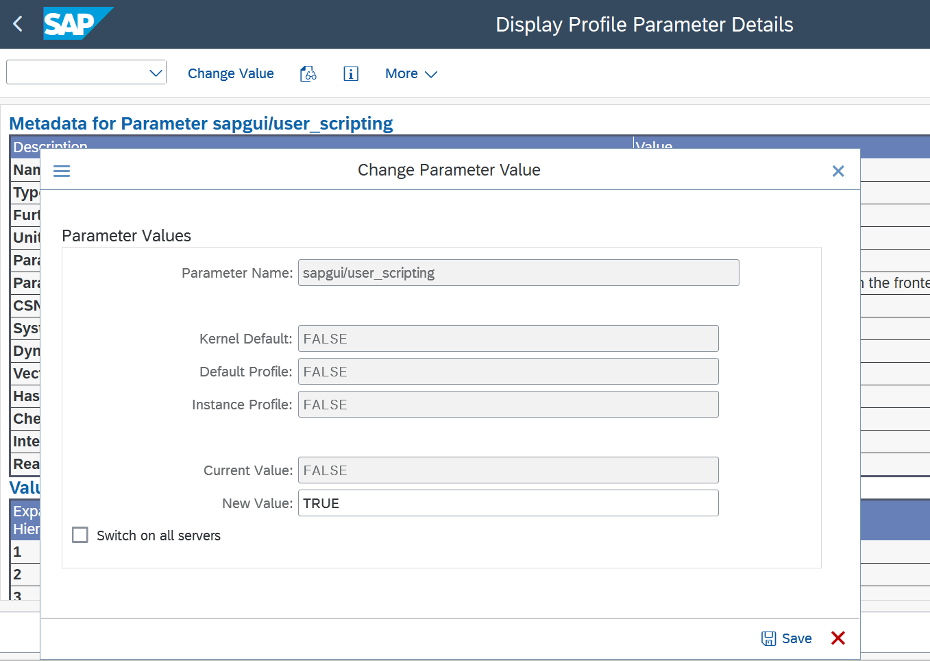 Search for the parameter: sapgui/user_scripting and click Display